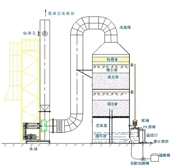 濕式除塵塔工作原理:廢氣由離心通風(fēng)機(jī)吸入塔體,經(jīng)由進(jìn)口的預(yù)噴淋系統(tǒng)除塵降溫,經(jīng)預(yù)處理后的氣體進(jìn)入填料層,水溶液由泵從循環(huán)水箱提升至塔頂,由螺旋噴嘴噴淋后附著在填料表面,由填料表面形成的液膜完成主要的收集工作,填料較大的比表面積提供氣相及固相間的物質(zhì)傳導(dǎo)。經(jīng)填料層處理后的氣體流經(jīng)除霧段阻隔并收集霧氣后,排入大氣中。煙囪出口粉塵量驗收標(biāo)準(zhǔn)參照《北京市大氣污染綜合排放標(biāo)準(zhǔn)》DB11501-2017。
