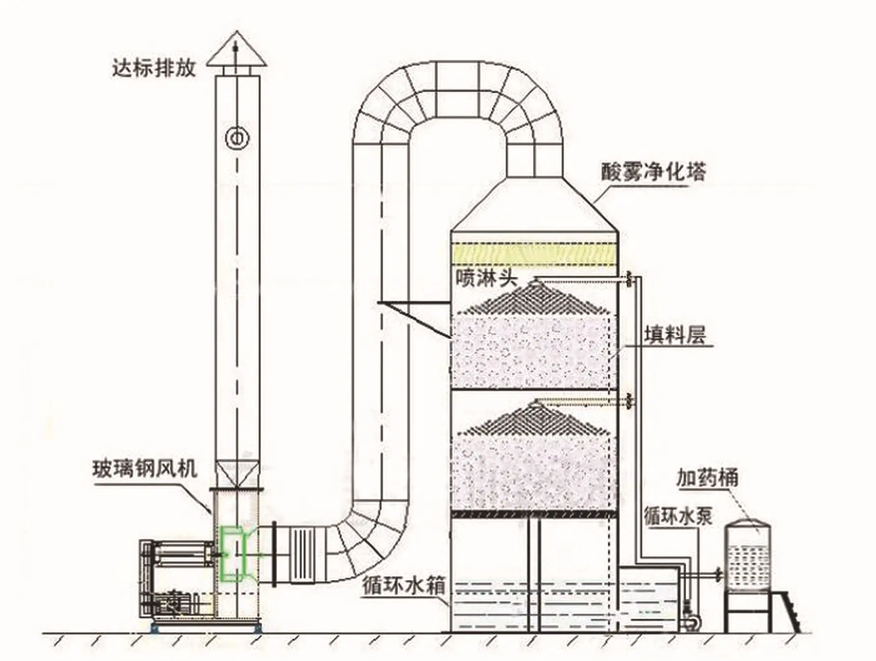 不銹鋼噴淋塔是廢氣處理工程中常用的凈化設備。是酸霧廢氣由風管引入凈化塔,經過填料層,廢氣與氫氧化鈉吸收液進液兩相充分接觸吸收中和反應,酸霧廢氣經過凈化后,再經除霧板脫水除霧后由風機排入大氣。
