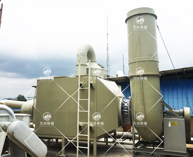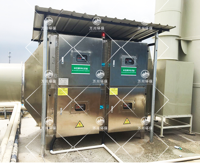 由于廢氣中含有一定的顆粒物,因此廢氣首先進到噴淋塔在進一步除去顆粒物和水溶性物質(zhì),而后進入到除霧器,過濾未完全凈化水分,而后進入UV光氧凈化器,最后再進行活性炭吸附裝置,該法具有處理效果高,運行穩(wěn)定優(yōu)點。