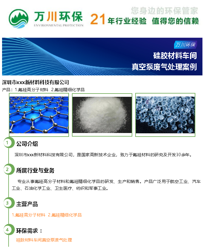 簡介: 深圳市xxx新材料科技有限公司,是國家高新技術企業,致力于氟硅材料的研究及開發30余年。萬川環保受邀對硅膠材料加工車間真空泵廢氣進行處理。本文介紹了硅膠材料真空泵廢氣處理中說使用的設備與方案。